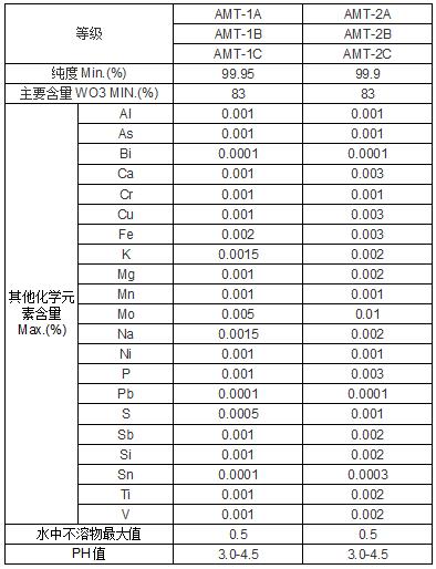 性质:偏钨酸铵水溶性的白色结晶粉末或微黄色。300g/100ml。偏钨酸铵溶于水,仲钨酸铵不易溶于水,这是偏钨酸铵和仲钨酸铵明显的区别之处。